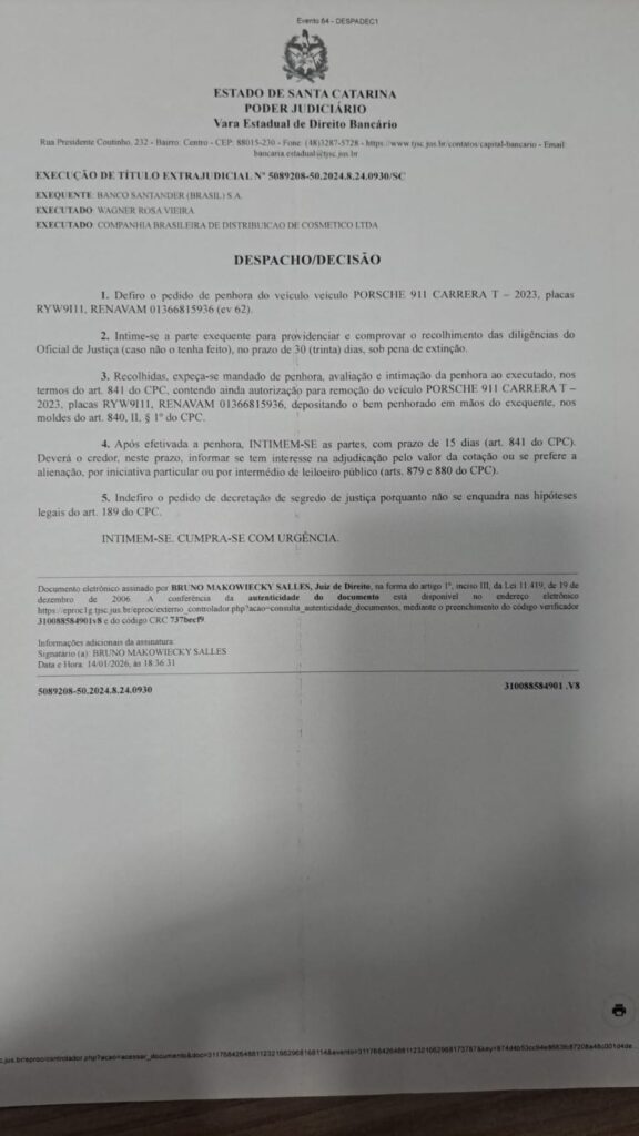 O Porsche 911 Carrera, avaliado em R$ 1,5 milhão, retirado do pátio de trânsito de Balneário Camboriú por uma pessoa desconhecida, tem busca e apreensão e está penhorado por conta dos débitos do automóvel, conforme documento abaixo.