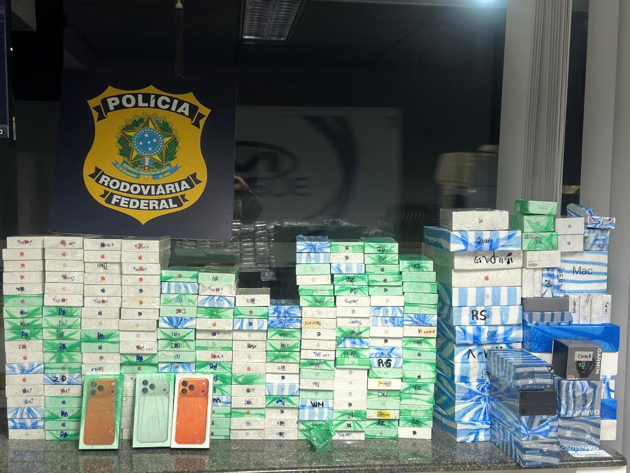 Durante a vistoria no interior do veículo, a equipe encontrou diversas mochilas carregadas com aparelhos de alto valor comercial, a maioria da marca Apple e sem embalagens originais. Ao todo, foram contabilizados 789 telefones celulares — incluindo modelos recentes como o iPhone 17 Pro Max — além de 86 itens de informática e fotografia, como MacBooks, iPads, relógios inteligentes e lentes profissionais.