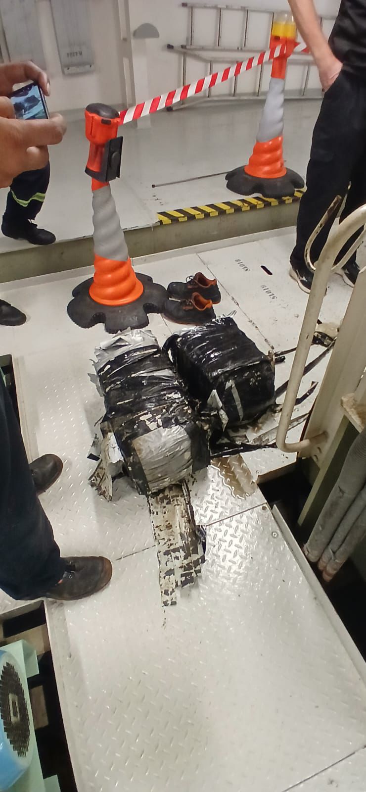 A droga foi localizada após a identificação de material suspeito no casco da tubulação de refrigeração. O material ilícito foi retirado e submetido a testes preliminares que indicaram tratar-se de cocaína.